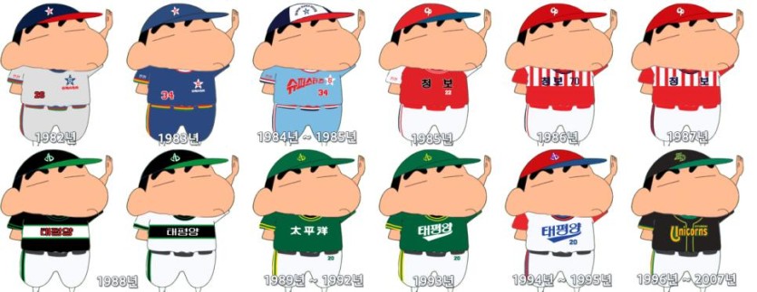 짱구로 보는 프로야구팀 유니폼의 변천사.jpg rh1 0 102 0 2025.02.13 13:15 해태 - KIA 타이거즈롯데 자이언츠빙그레 - 한화 이글스삼성 라이온즈OB - 두산 베어스MBC 청룡 - LG 트윈스삼청태현히어로즈SK 와이번스 - SSG 랜더스 0