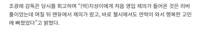 조광래 감독 피셜로 리버풀, 맨유, 첼시 순으로 이적 제의가 왔다고 함