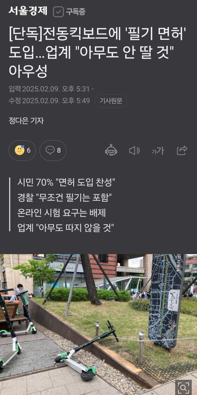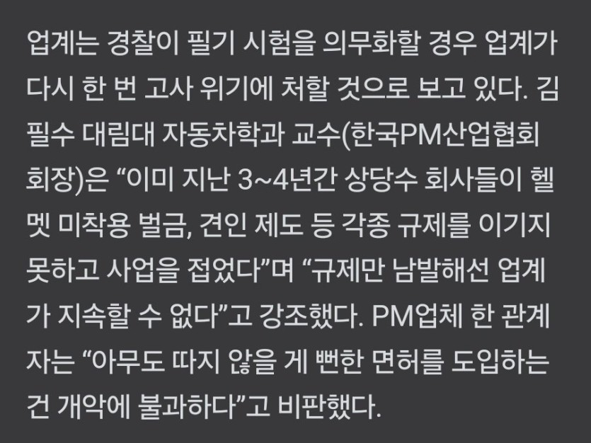 '전동킥보드 면허' 도입예정... 업계 비명. rh1 0 81 0 2025.02.09 18:45 2,387건 사고중 907명이 미성년자 무면허 사고업계는 온라인 교육으로만 하자고 밀었는데여론 압도적 찬성으로 필기시험 필수로 가는중좃같이 던지고가는것도 막자일본처럼 사용후 반납공간 즉 쏘카처럼 만들어야됨. 0