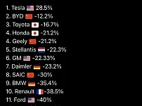 지난해 기준 브랜드별 전기차 이익률이라는데정확하지는 않겠지만 그렇다고 터무니 없는 자료는 아닐 겁니다여튼 이 자료만 보면 테슬라만 플러스네요다른 브랜드들은 이제 전기차 투자 단계…