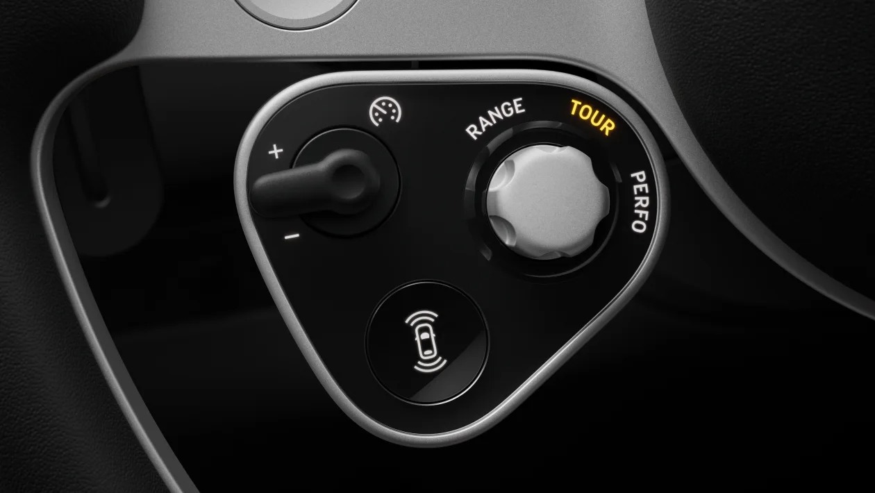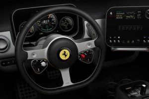 스티어링 휠은 1950~60년대 페라리의 상징인 나르디(Nardi) 목재 핸들에서 영감을 받았다. 100% 재활용 알루미늄 합금으로 제작했으며, CNC 정밀 가공한 19개 부품을 조립해 기존 페라리 핸들보다 400g 가볍다. 양쪽 스포크 상단에 두 개의 아날로그 버튼 모듈을 배치했는데, 오른쪽은 파워트레인 모드(레인지·투어·퍼포먼스), 왼쪽은 서스펜션·와이퍼를 포함한 마네티노를 제어한다. 페라리의 기존 핸들이 앞뒤로 수십 개의 버튼이 산재한 복잡한 구성이었던 것과는 대조적이다.