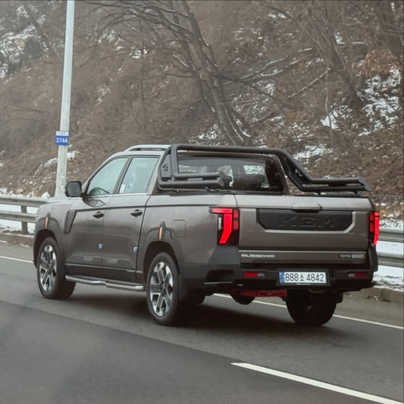전에 신차 발표회 때는 못 봤는데, 전면부터 앞 펜더까지 이어지는 선이 든든하더군요. 강인한 얼굴과 넓은 어깨가 조화를 이룬 느낌입니다. A필러 아래에서 뒤로 뻗은 캐릭터 라인 덕에 측면은 시원하고요. 무쏘 EV에서 봤던 펜더 포인트가 액센트가 됩니다. 뒷모습은 중앙의 블랙 패딩이 심심함을 없애줍니다.