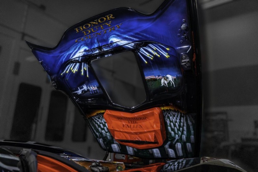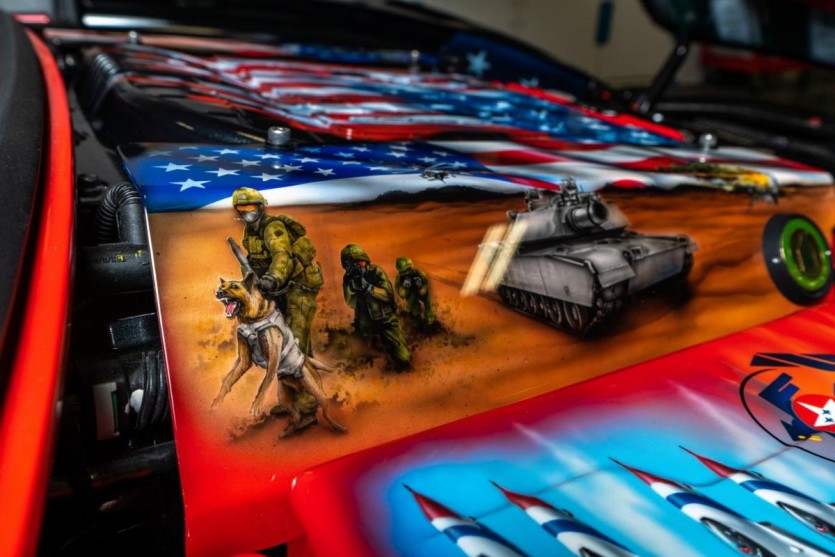 이 차는 육군, 해군, 공군, 해병대 및 해안 경비대를 포함한 거의 모든 패널에서 군대에 경의를 표합니다. 그러나 러시아 헬리콥터, USS 아이오와 전함, 독일 셰퍼드가있는 군인, 그리고 그 말을 쏘는 미군 헬기를 묘사 한 것은 후드의 밑면과 엔진 베이의 이미지입니다. '명예, 의무, 국가'.