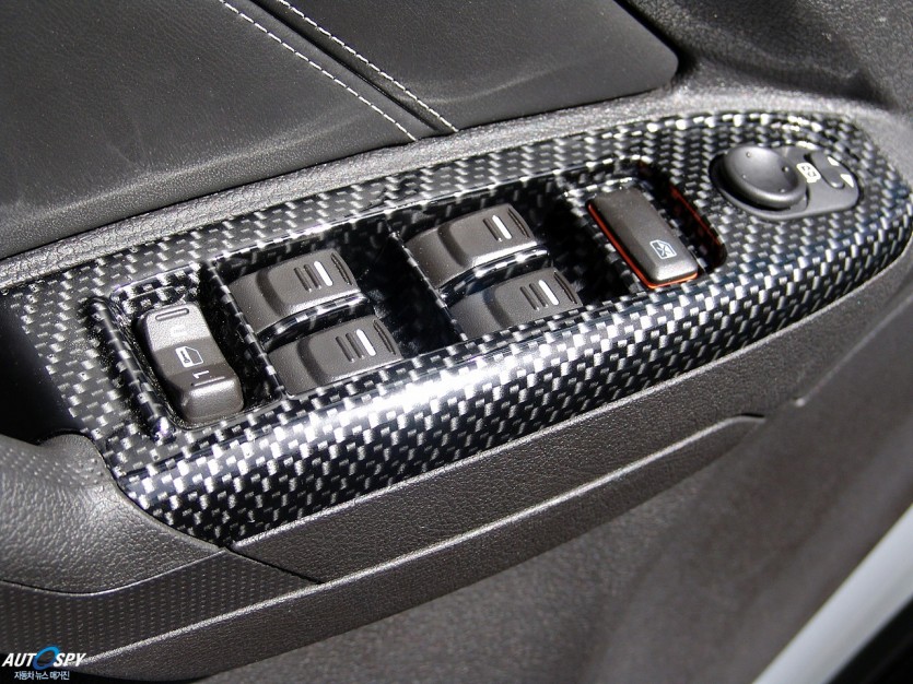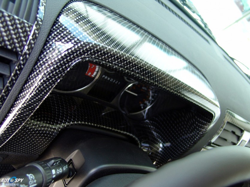 레이싱 스트라이프를 연상시키는 띠와 흰색 보디가 조금 어색하지만 와이드보디 스타일의 풀 보디키트를 붙여 강한 인상을 주고 센터페시아를 비롯해 실내 곳곳에 카본파이버를 사용해 포인트를 주었다.