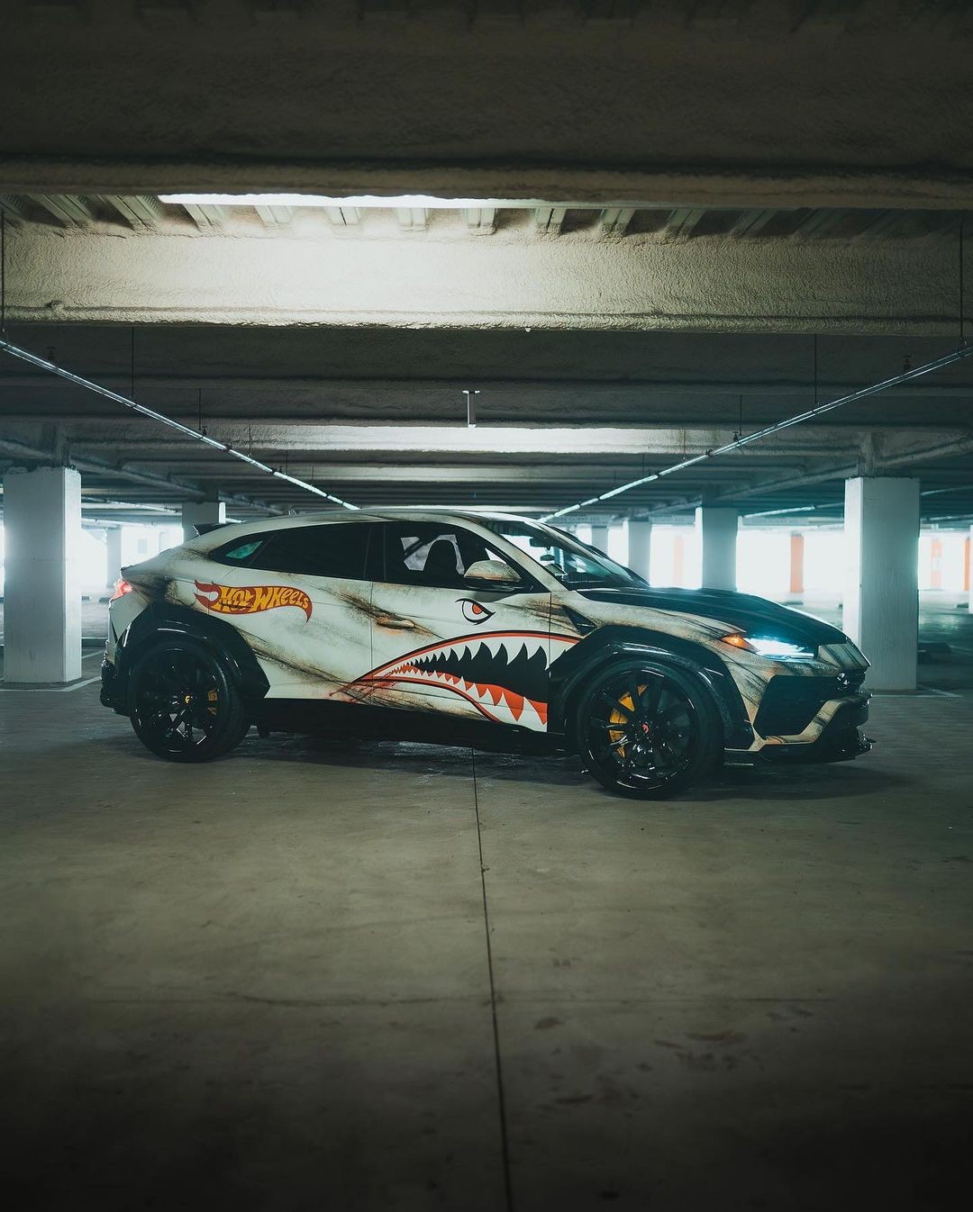 대담한 랩핑으로 인해 나머지 변경 사항을 무시하기 쉽습니다. 하지만 이 람보르기니 우루스는 와이드 바디 키트도 갖추고 있습니다. 이것은 전면과 후면을 포함하여 사방에 추가 파츠로 구성되며, 사이드 스커트와 초광폭 휠 아치가 결합됩니다. 후드도 애프터마켓에서 가져온 것으로 보이며, 휠 전문가는 아니지만 검은색으로 오목하게 들어간 세트는 포스트 프로덕션에서 적용된 것으로 보입니다.