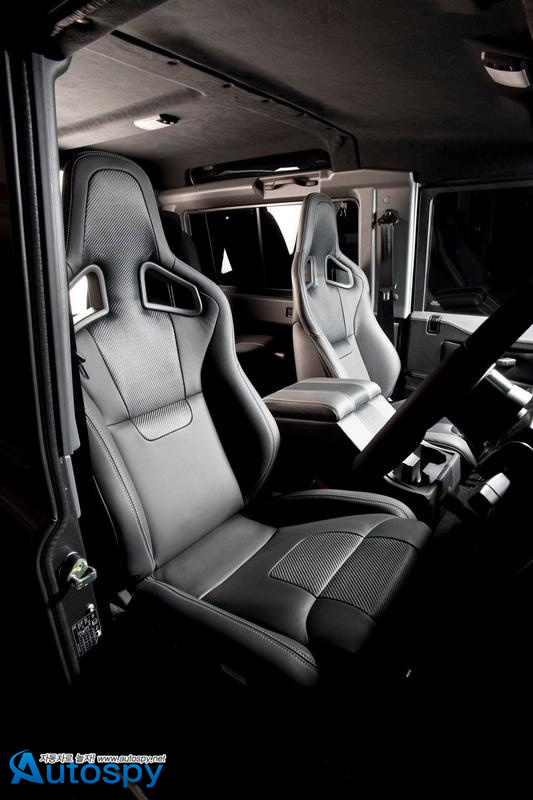 실내에선 알파인 위성 내비게이션 시스템과 후방 카메라를 달고 서브 우퍼를 더해 풍부한 저음을 들려준다. 투박한 외형에 다소 어울리지 않는 시트는 레카로 스포츠스터 CS 제품으로 나파 가죽으로 꾸몄으며 옵션으로 스티칭이 들어간 알칸타라를 마련했다. 전용 카펫과 가죽을 두른 스티어링 휠도 고급스럽다.