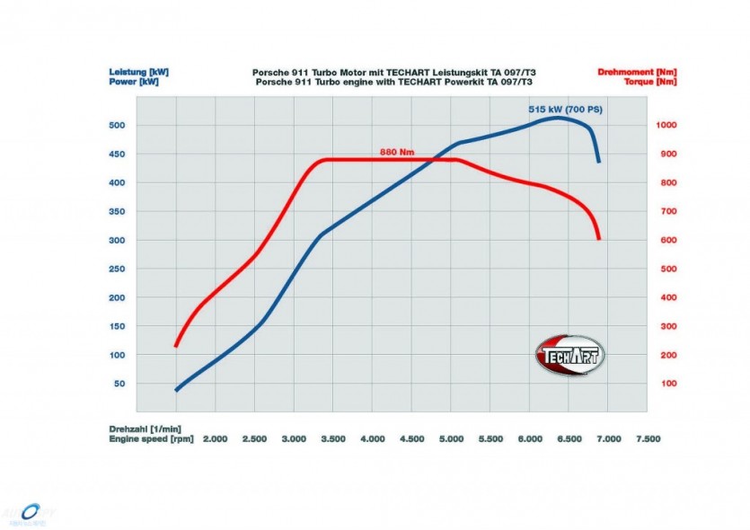 독일 튜너 테크아트(TechArt)가 포르쉐 911(997) 터보를 위한 새 파워키트를 공개했다. 테크아트의 TA 097/T3 키트를 붙이면 911 터보의 3.8L 엔진 최고출력이 500마력에서 700마력(PS)으로 오른다. 최대토크는 800Nm. 이러한 출력 향상 덕분에 제로백이 수퍼카 수준에 이르는 2.8초에 불과하고 200km/h는 9초면 충분하다. 최고시속은 352km/h.