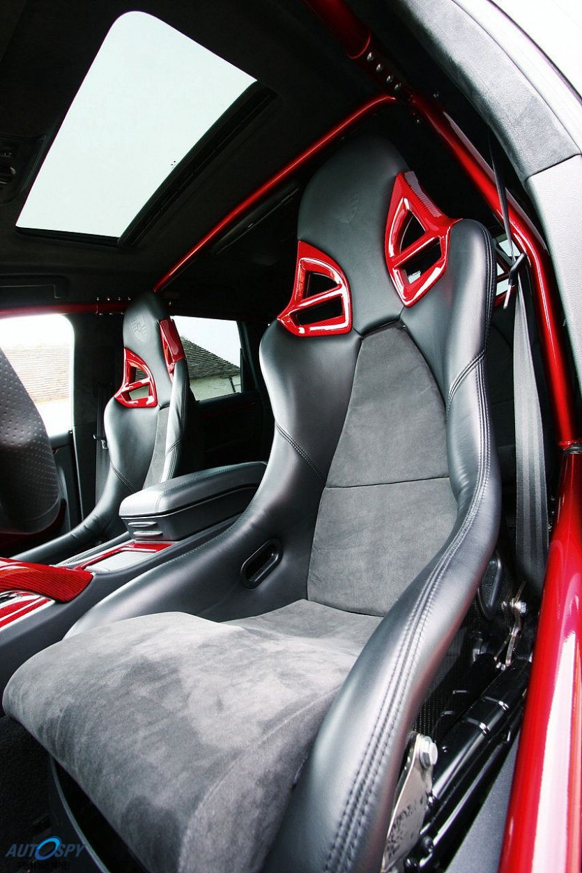 실내는 레드컬러의 페인팅과 롤 케이지로 스파르탄한 이미지를 강조했다. 스티어링 휠과 센터페시아 등 곳곳에 레드 카본 파이버로 포인트를 주었고 폼나는 레이싱 버킷 시트는 GT3에서 가져온 것이다.