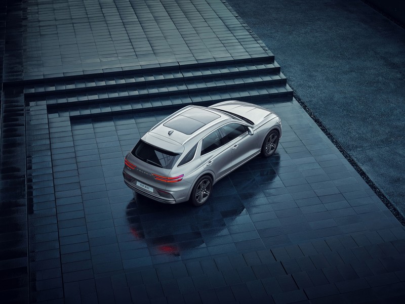 전면부는 지-매트릭스(G-Matrix) 패턴을 그라데이션 형태로 입힌 새로운 형상의 크레스트 그릴과 더불어 와이드한 느낌을 주는 범퍼 디자인, 정제된 인테이크 그릴 패턴을 바탕으로 전동화 SUV만의 세련된 감성을 표현했다.