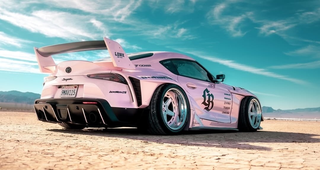 이번 수프라의 컬러는 과감한 핫핑크가 아니라 연어색에 가까운 톤이다. 여기에 매트 블랙 디테일과 전용 데칼을 더해 대비감을 확보했다. 외부 색감만으로도 충분히 특별하지만, 이 차량을 더 강렬하게 만드는 요소는 따로 있다. 바로 리버티 워크가 제작한 와이드바디 키트다.