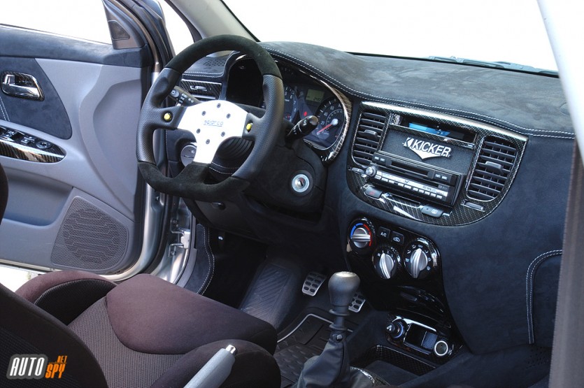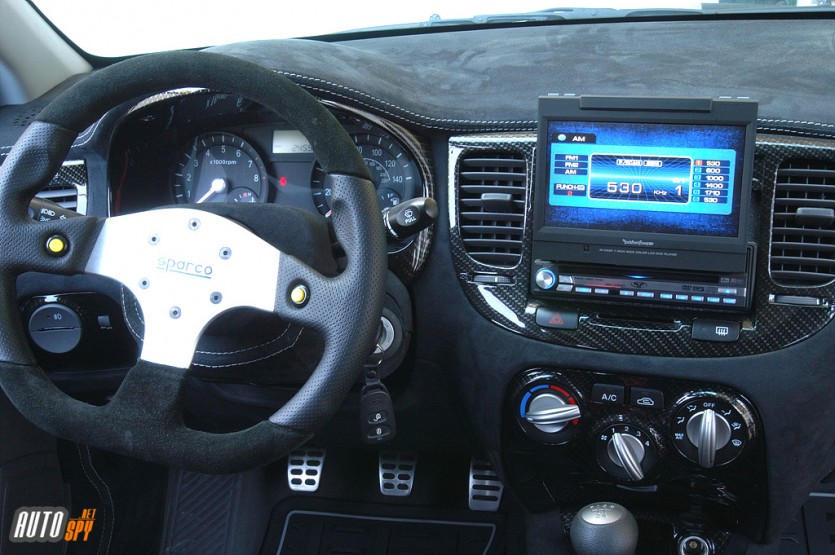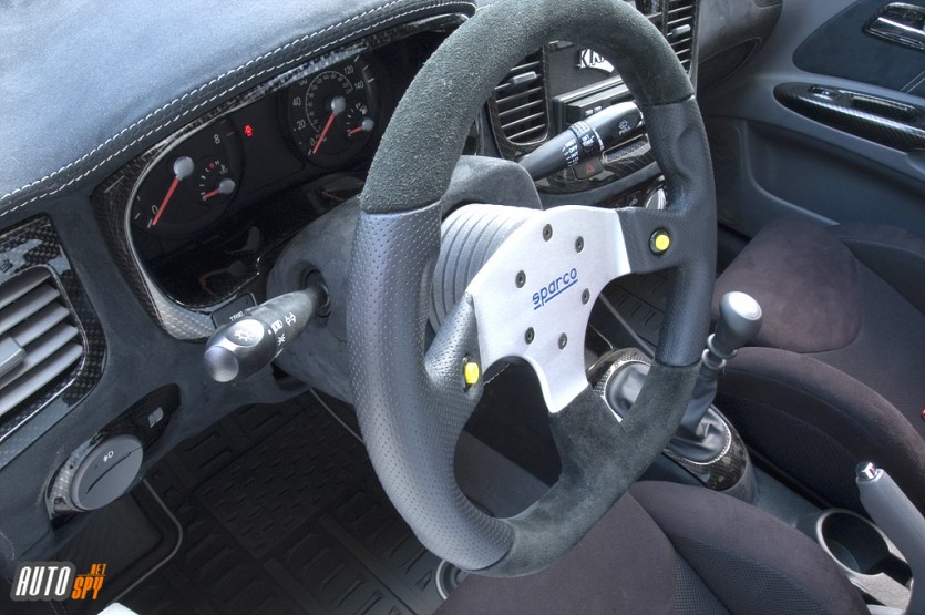 스웨이드와 카본소재로 꾸민 실내는 커스텀 모델답게 야무지고 스파르코 레이싱 시트와 스티어링 휠, 락포드 포스게이트 오디오 헤드유닛 등이 눈에 띈다.