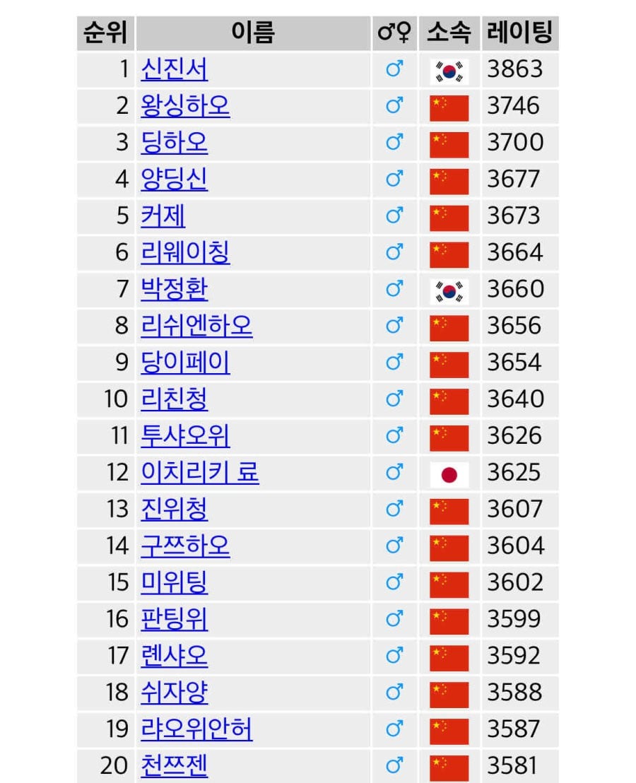 한국 바둑 최강자 최후의 보루 rh1 0 97 0 2025.05.20 12:15 바둑 랭킹 1위의 최후의 보루로 중국 바둑의 러쉬를 홀로 막아내고 있는 신진서 Top 20 기사 중 17명이 중국일 정도로 중국 기사들이 엄청난 속도로 치고 올라오고 있는데 냉정히 신진서 뒤가 없는게 아쉽긴 하네요 바둑 최강자 최후의 보루라 봐야 한국 바둑 최강자 최후의 보루 0