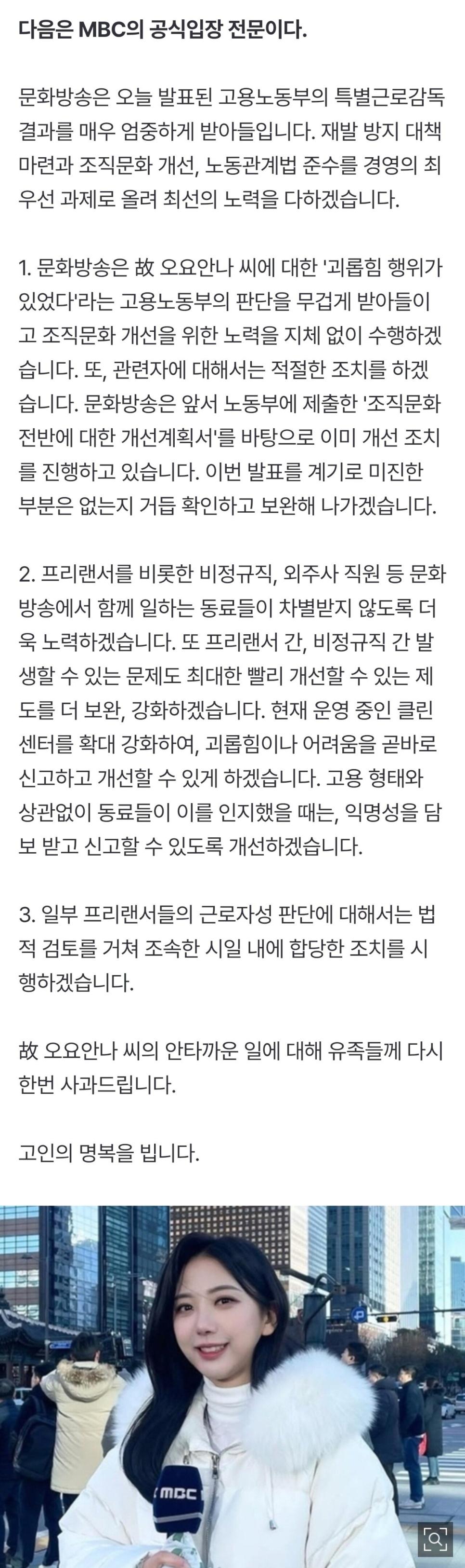 MBC 고 오요안나 결과 무겁게 받아들여…관련자 조치할 것"