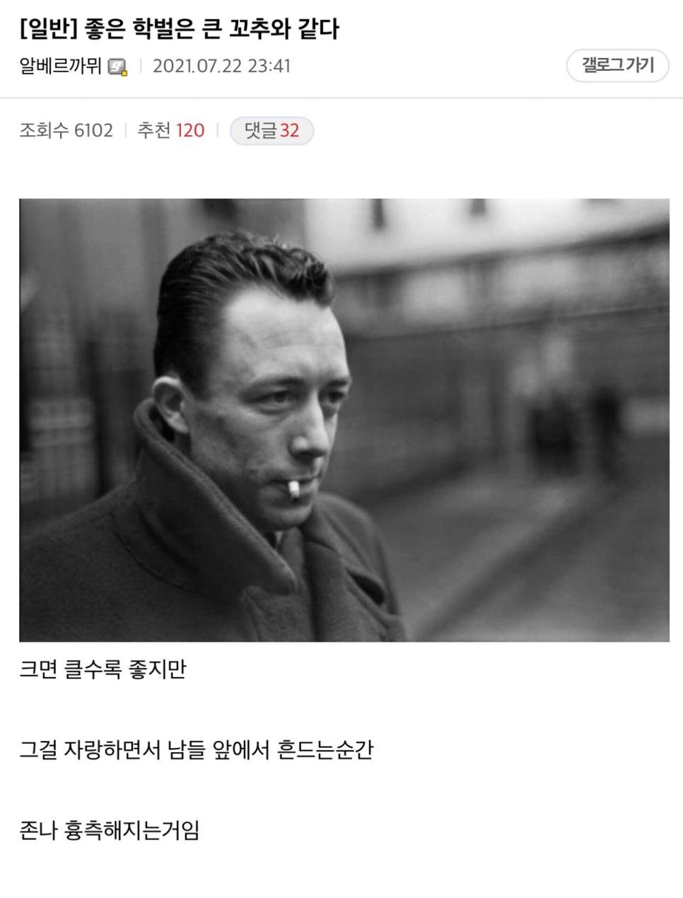 좋은 학벌은 큰 꼬추와 같다.jpg rh1 0 98 0 2025.05.20 06:45 https://m.ppomppu.co.kr/new/bbs_view.php?id=humor&no=670085 0