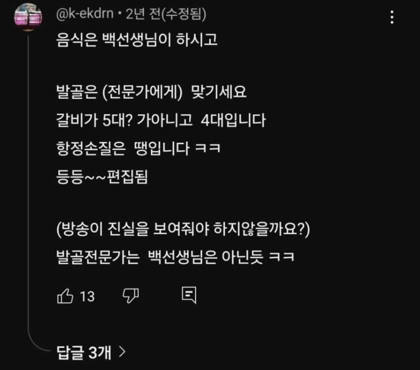 돼지 발골 전문가 백종원의 당시 유튜브 댓글 rh1 0 96 0 2025.05.19 13:15 https://youtu.be/LUPUBIMLJvw 일반인들이야 우와 백종원 선생님 돼지 발골도 할 줄 아시는구나지만 전문가들이 볼때는 그냥 쌩초보 수준임.최근 댓글도 아니고 민심 좋을때 댓글 수준 이분들 시선에서 발골 책도 쓰고 방송에서도 전문가라고 칭송하는 거 보면 개그 수준 0