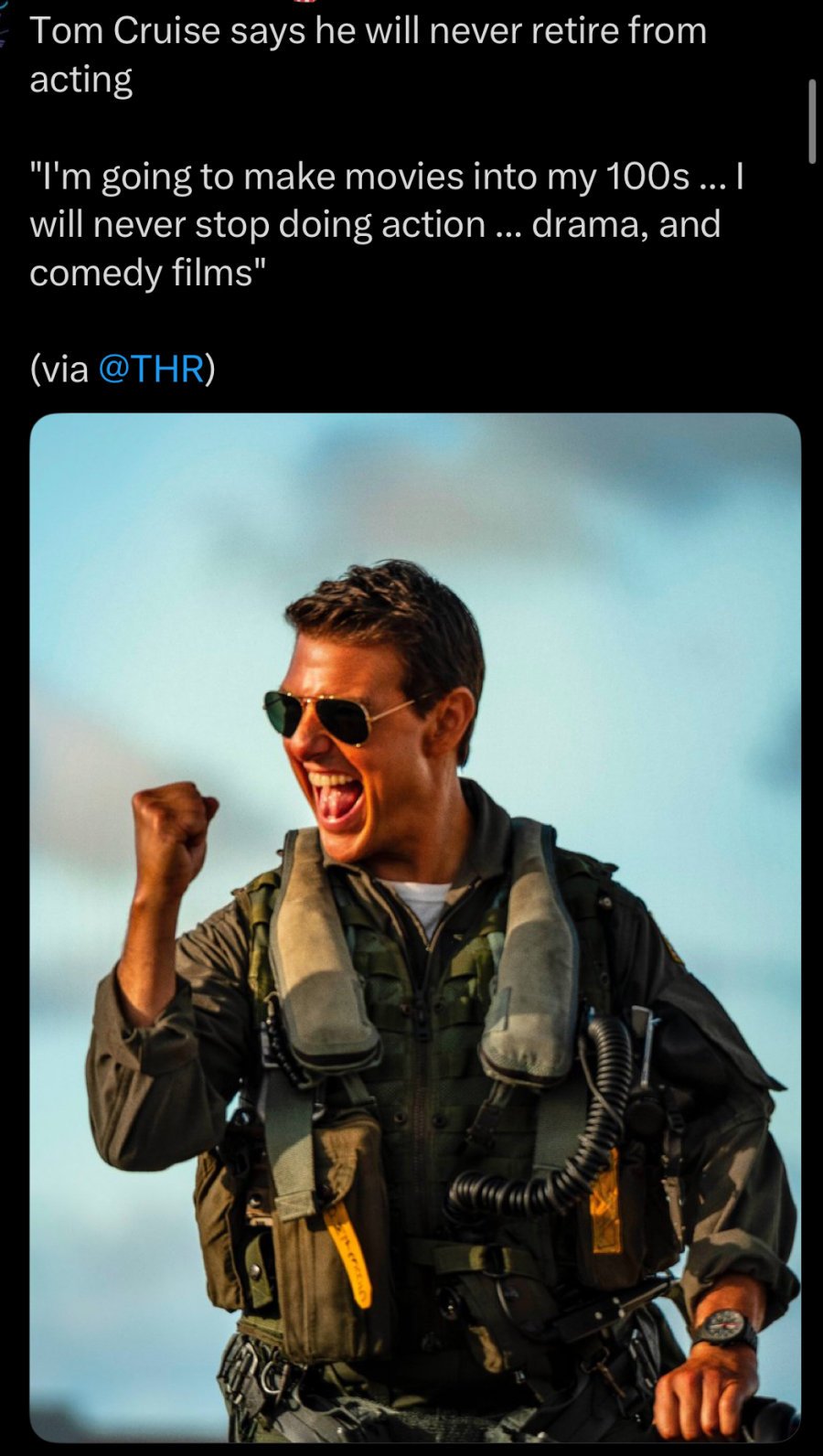 배우 은퇴는 없을 거라고 얘기한 톰 크루즈 rh1 0 97 0 2025.05.19 14:15 나는 100살이 되어서도 영화를 만들거야. 액션, 드라마, 코미디 하는 걸 멈추지 않을거야. 배우 은퇴는 없을 거라고 얘기한 톰 크루즈 0