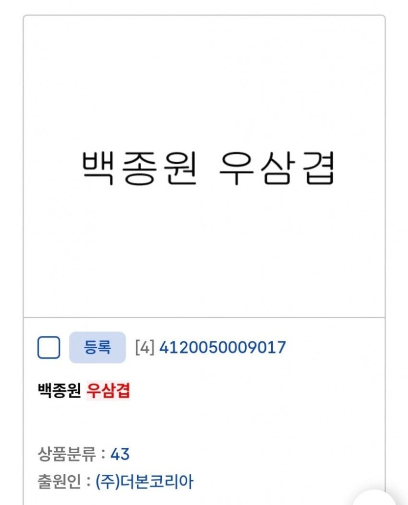 뭔가 짜치는 백종원 상표등록 근황 rh1 0 97 0 2025.05.19 06:15 우삼겹도 내가 만든거여~거절백종원 추가해서 통과~똥튀김은 대체 크크크..치킨 콜라 서비스도 개발하신 백선생님예산시장 사업 중 등록한 상표대충 정형돈의 이것저것 다 찔러보는거지 짤 0