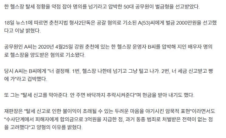 탈세 약점 잡아 헬스장 빼앗은 공무원 rh1 0 96 0 2025.05.19 00:15 저걸 협박용으로 삼은 공무원도 어질어질한데, 대체 탈세 수준이 어느 정도길래 헬스장을 통째로 넘겨주는 선택을...? 탈세 약점 잡아 헬스장 빼앗은 공무원 0