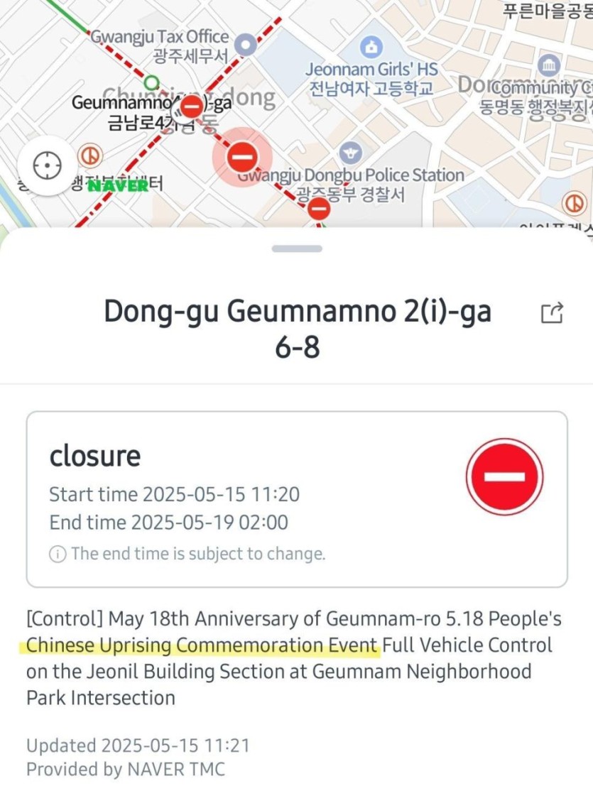 네이버 지도에서 5.18 민중항쟁 기념행사 전야제를 영어로 Chinese Uprising Commemoration Event 라고 번역하는 사건이 발생