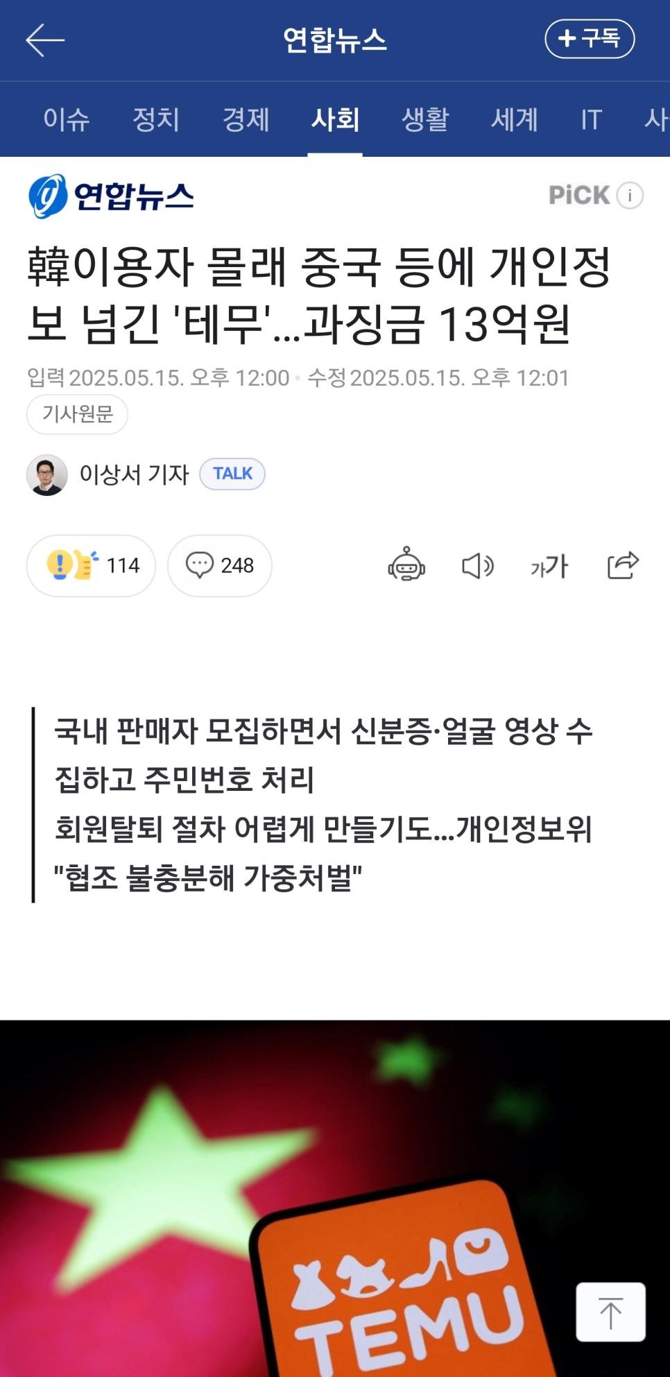 테무가 한국인들 개인정보 중국 등에 넘겨서 과징금받음