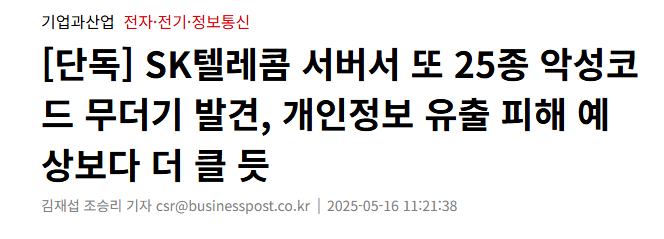 SK텔레콤 서버 또 25종 악성코드 무더기 발견 rh1 0 134 0 2025.05.18 00:30 https://www.businesspost.co.kr/BP?command=article_view&num=395443최초 해킹 사건 보고때 악성코드 4종이 발견됐다고 신고이어 이번달 3일 민관합동조사때 8종류가 추가 발견이번에 25종의 새로운 악성코드가 발견 앞서 공개된 12종류는 가입자 전화번호, 가입자식별키 등 유심 복제에 악용될수 있는개인정보와 SK텔레콤 자체 관리 정보였는데이번에 공개된 25종은 네트워크 서버에서 발견됐고이것도 개인정보를 빼내기 위한 코드로 전해짐 저번 민관 협동 조사때 개인을 특정할수 있는 정보 유출은 없었다고 했지만이번 악성코드 발견으로 개인정보 대량 유출 가능성도 배제하기 어려워짐 0