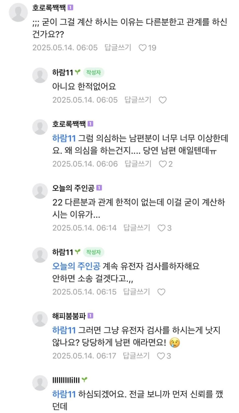(맘카페)실시간 친자유무.jpg rh1 0 97 0 2025.05.17 14:30 요약하자면 전글에 전남친 몰래 만났다가 지인이 현남편한테 당신 아내가 전남친 몰래 만나고 다닌다 이야기해줌ㅋㅋ 그후 남편이 자기 애가 아닌거같다 빡쳐서 이혼하자하는데여자는 유전사 검사 끝까지 안하고 버티는중 0