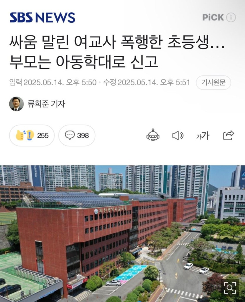 싸움 말린 여교사 폭행한 초등생...부모는 교사를 아동학대로 신고 rh1 0 96 0 2025.05.17 14:15 https://naver.me/FJINDFCf1. 초딩 5학년 2명이 싸움 2. 교사가 말림. 3. 학생이 교사 훈계 듣기 싫다고 자리 이탈 4. 교사가 따라가자 학생이 교사 머리채 잡고 주먹으로 얼굴 등을 수차례 폭행 5. 교사가 교권보호위원회 신청 6. 가해 학생 부모가 교사를 아동학대로 신고함 개판 0