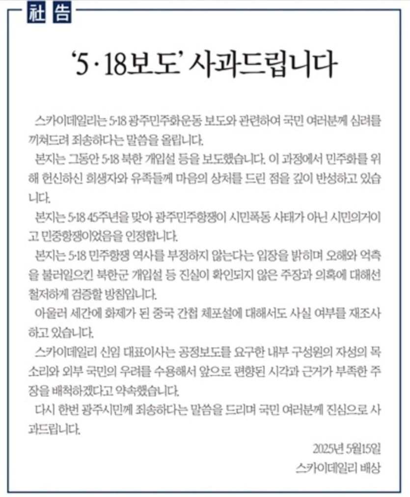 스카이데일리 5.18 광주민주화운동 북한 개입설 보도 사과