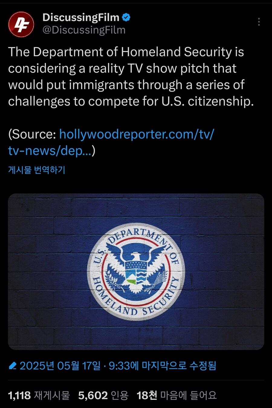 미국 국토안보부, 시민권으로 리얼리티 쇼 기획중 rh1 0 97 0 2025.05.17 12:45 이민자들이 일련의 도전을 통해 미국 시민권을 얻기 위해 경쟁하는 리얼리티 TV 쇼 제작 고려중 0