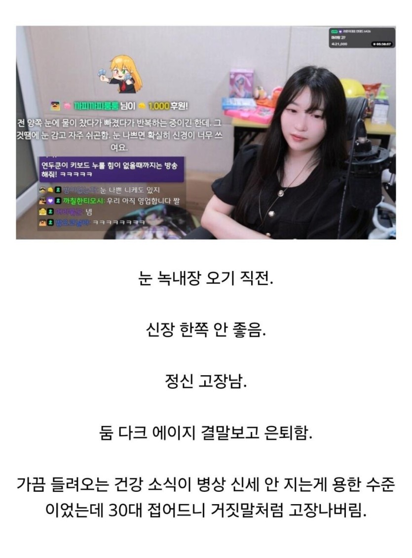 ㅇㅂ)13년차 종합게임 스트리머의 끝 rh1 0 102 0 2025.05.16 09:45 연두라는 종합게임 스트리머라고 함.앉아서 몇시간을 일하는데 거기에 고칼로리 음식 같은걸로 때우니까 겉은 멀쩡해도 속은 고장나는 사람이 나오나보네. 0