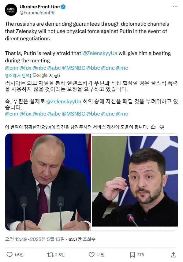 푸틴, 젤렌스키와 협상시 젤렌스키가 폭력을 쓰지 않는다는 보장 요구