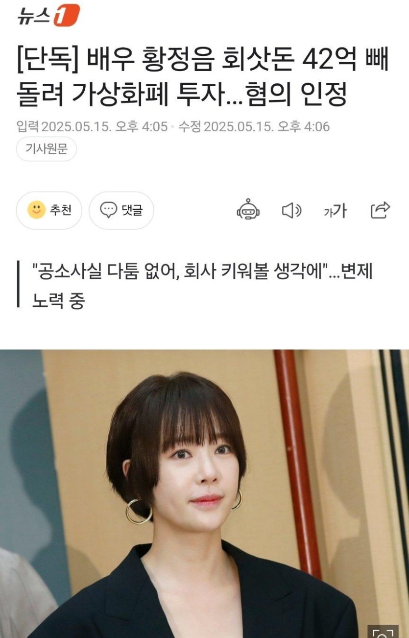 배우 황정음 회삿돈 42억 가상화폐 투자 했다는 거 이거 웃기네요;