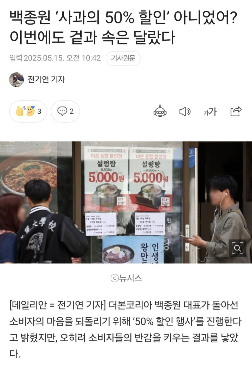 백종원 ‘사과의 50% 할인’ 아니었어? 이번에도 겉과 속은 달랐다 rh1 0 97 0 2025.05.15 12:30 https://n.news.naver.com/article/119/0002956473?sid=102 0