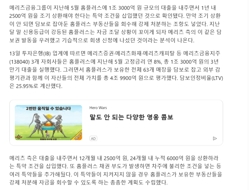 그런데 금융권 분석에 따르면 메리츠 측에 일정 금액 상환이 힘들어 보이자