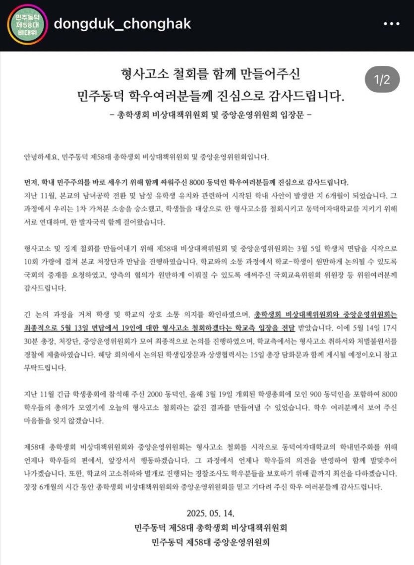 동덕여대 형사고소 취하