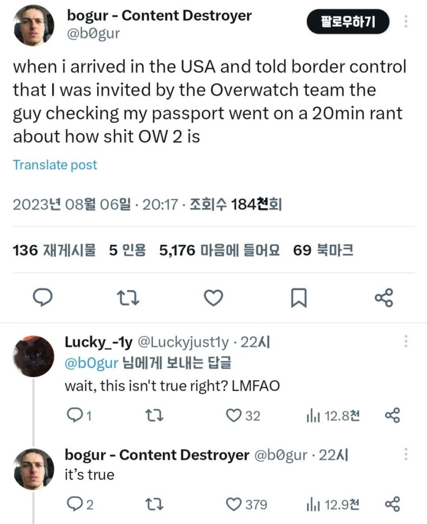 입국심사원에게 20여분간 폭언을 들었다는 프로게이머.jpg rh1 0 140 0 2025.05.14 20:15 프로게이머: 내가 미국에 입국했을때 국경통제소에 오버워치2 프로게이머라고 하니깐 입국 심사원이 오버워치2가 얼마나 구린지에 대해 20여분간 폭언을 했음. 0