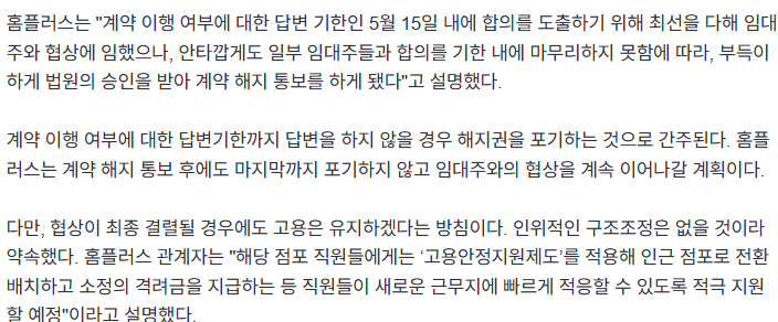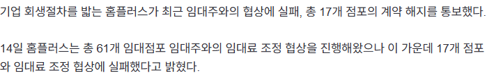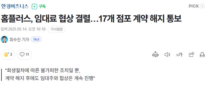 홈플러스, 임대료 협상 결렬…17개 점포 계약 해지 통보 rh1 0 101 0 2025.05.14 19:15 https://n.news.naver.com/mnews/article/050/0000090785 홈플러스, 임대료 협상 결렬…17개 점포 계약 해지 통보 0