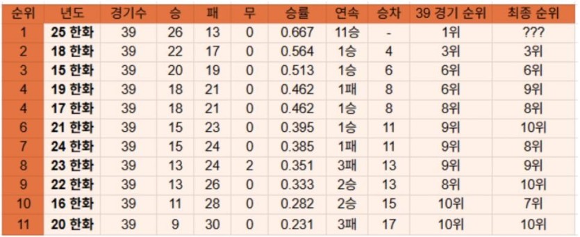 ??? : 한화 시즌 초에만 날아다니고 꼬라박던데 올해도 그런거 아님? rh1 0 96 0 2025.05.14 05:15 암흑기 이후 한화는 시즌 초반에도 날아다녔던적이 없는데스18년은 우주의 기운을 담아 가을냄새 딱 한번 맡아본 시즌이었고 올해는 우승 이후로 역대급 초반 성적 0