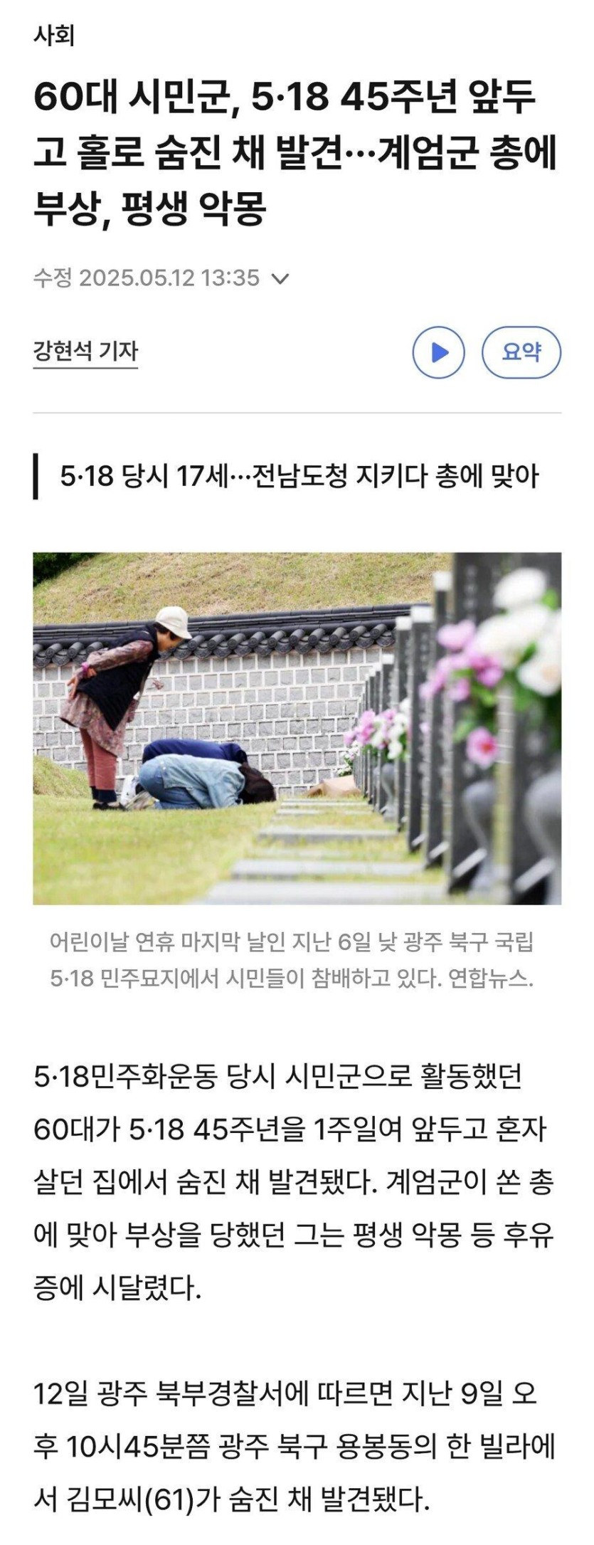 60대 시민군, 5·18 45주년 앞두고 홀로 숨진 채 발견(되셨다네요) rh1 0 179 0 2025.05.14 02:15 삼가 고인의 명복을 빕니다.상처입힌 자들은 호의호식하며 때빼고 광내고 골프치다가 호상하는 세상에서는상처받은 자들은 죽을때까지 치유 받지 못한채 상처를 끌어 안고 살 수 밖에 없는 거 같습니다. 0
