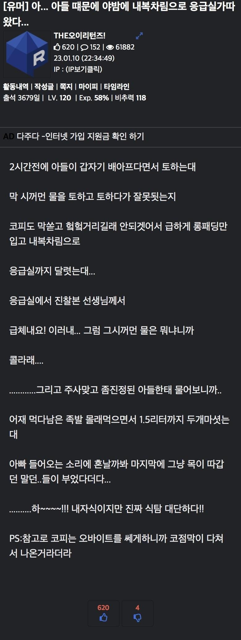 아들때문에 야밤에 내복차림으로 응급실 다녀옴
