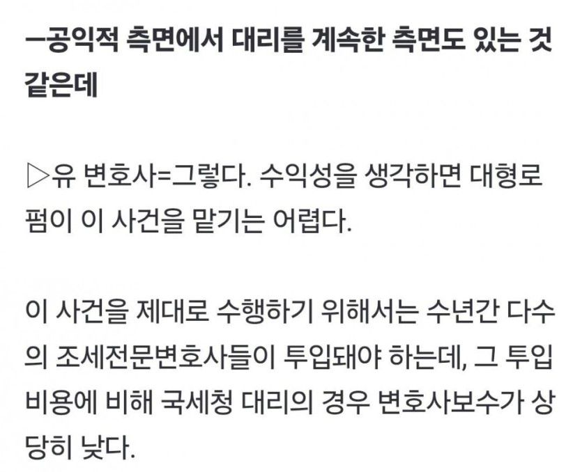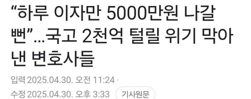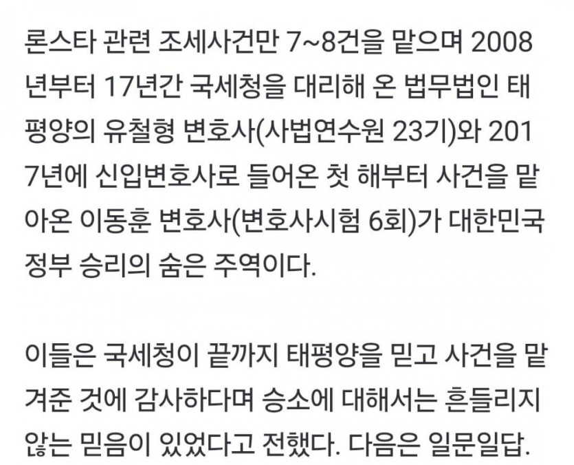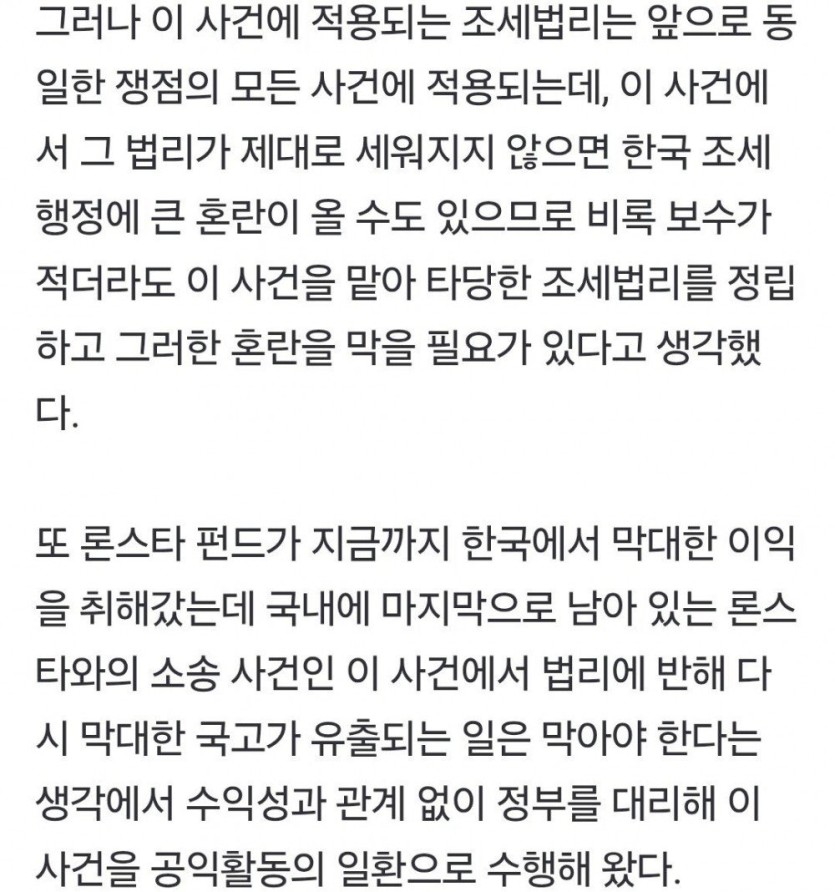 국민 세금을 지킨 대한민국 변호사들 rh1 0 97 0 2025.05.12 20:15 https://m.mk.co.kr/news/society/11305463 법무법인 태평양은 론스타가 승소한 1,2심 판결을 대법원에서 뒤집고 대한민국 국고 유출을 막음 8년간 이어진 소송에서 대한민국이 승리함. 국민 세금을 지킨 대한민국 변호사들 0