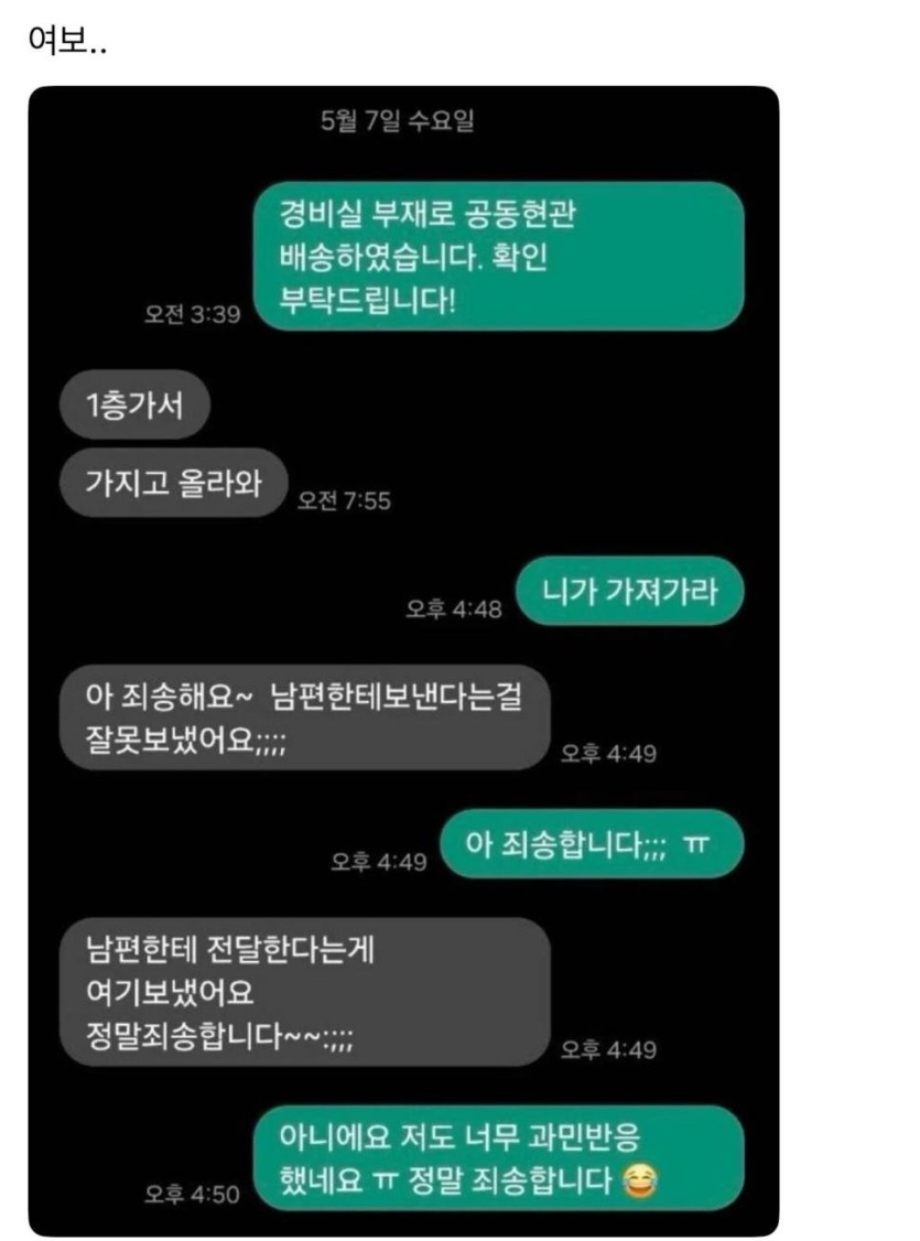 ? : 경비실 부재로 공동현관에 배송하였습니다.