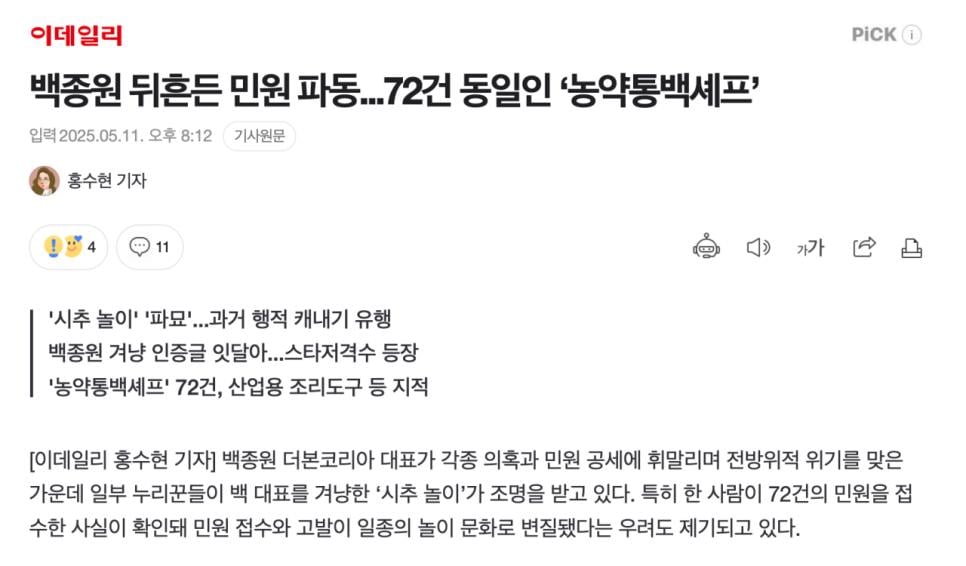 백종원 뒤흔든 민원 파동...72건 동일인 ‘농약통백셰프’ rh1 0 117 0 2025.05.12 10:30 "민원 접수와 고발이 일종의 놀이 문화로 변질됐다는 우려도 제기"편향된 기사가 쏟아지네 ㄷㄷㄷㄷㄷ 0