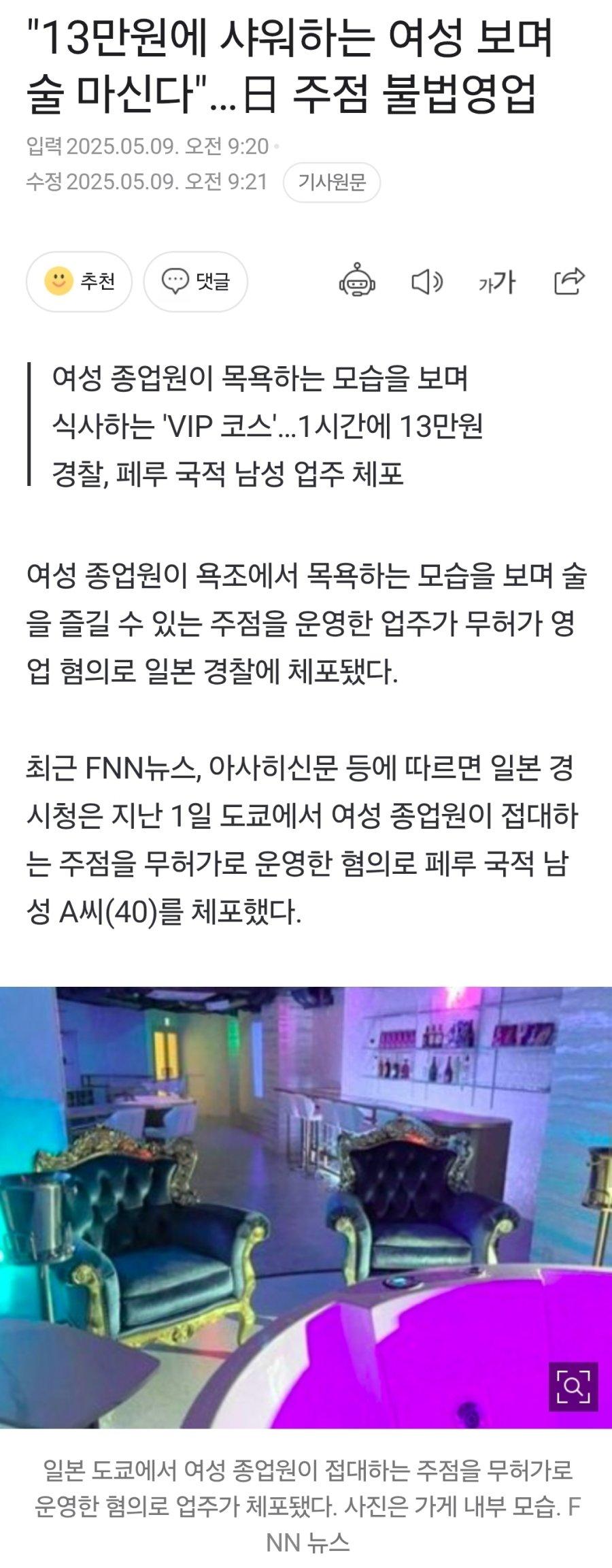 "13만원에 샤워하는 여성 보며 술 마신다"…日 주점 불법영업.
