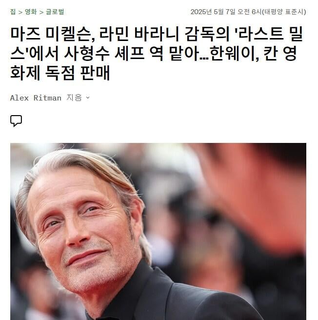 매즈 미켈슨 신작 영화 rh1 0 98 0 2025.05.11 17:00 전직 백악관 요리사였던 매즈 미켈슨이교도소에서 사형수를 위한 마지막 요리를 하는 요리사가 되어사람들과 소통하는 영화를 찍는다고 함 형 사형수가 식재료되는거 아니지?? 0