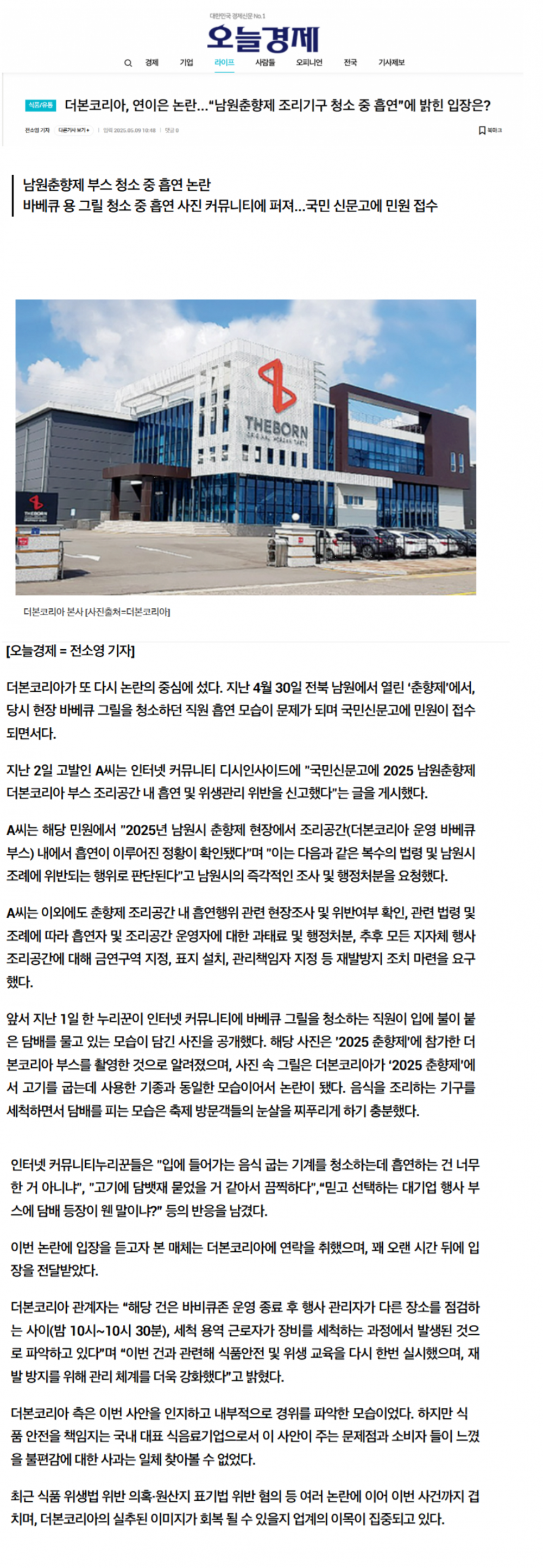 더본코리아 "남원춘향제 조리기구 청소 중 흡연 인정" rh1 0 97 0 2025.05.11 09:15 더본코리아 남원춘향제 조리부스 흡연 사실로 밝혀져 더본코리아 흡연사실 인정 더본코리아 "남원춘향제 조리기구 청소 중 흡연 인정" 0