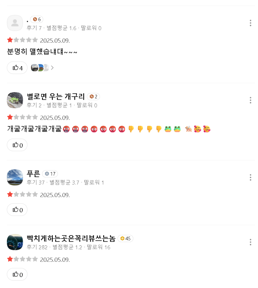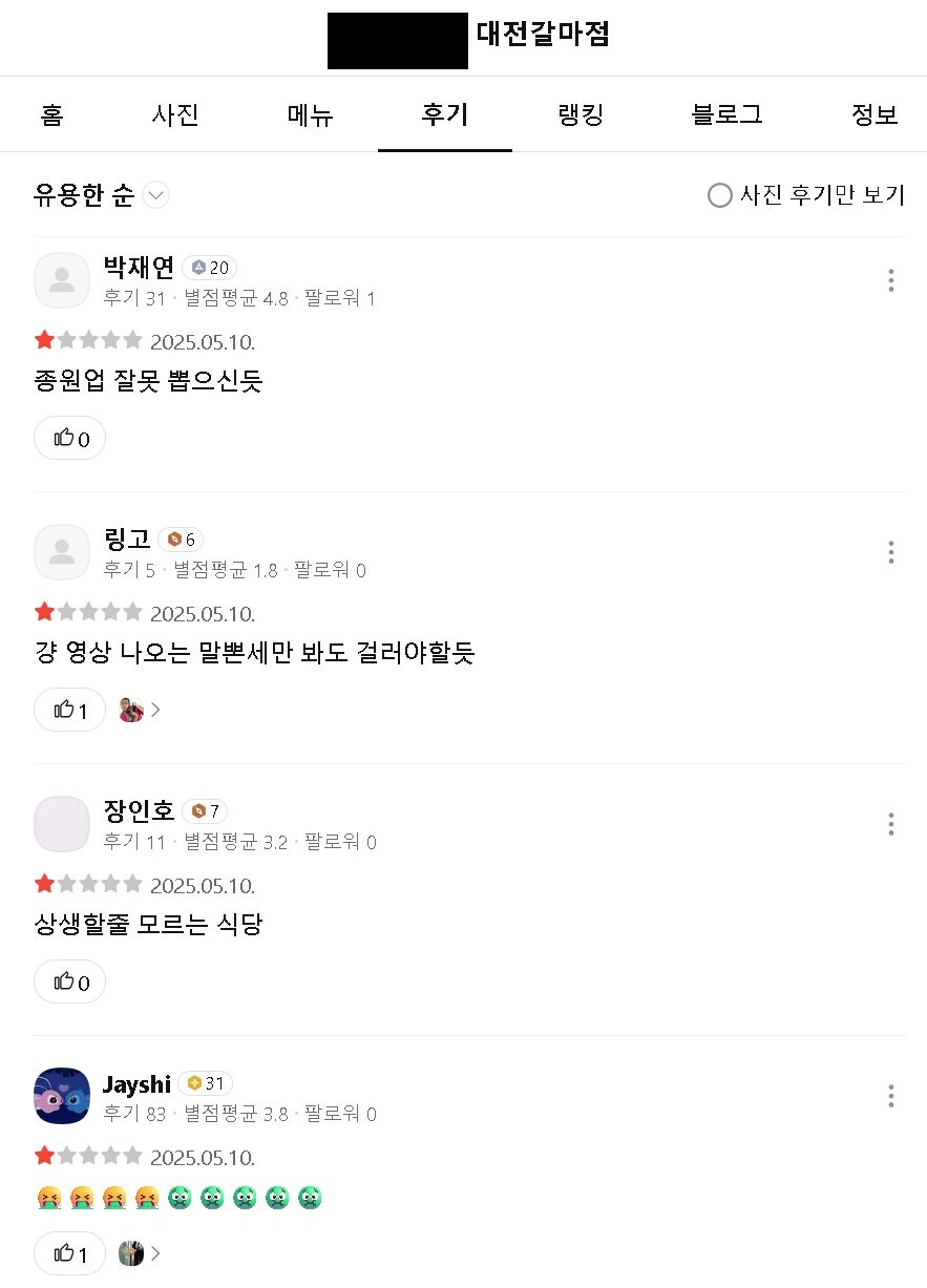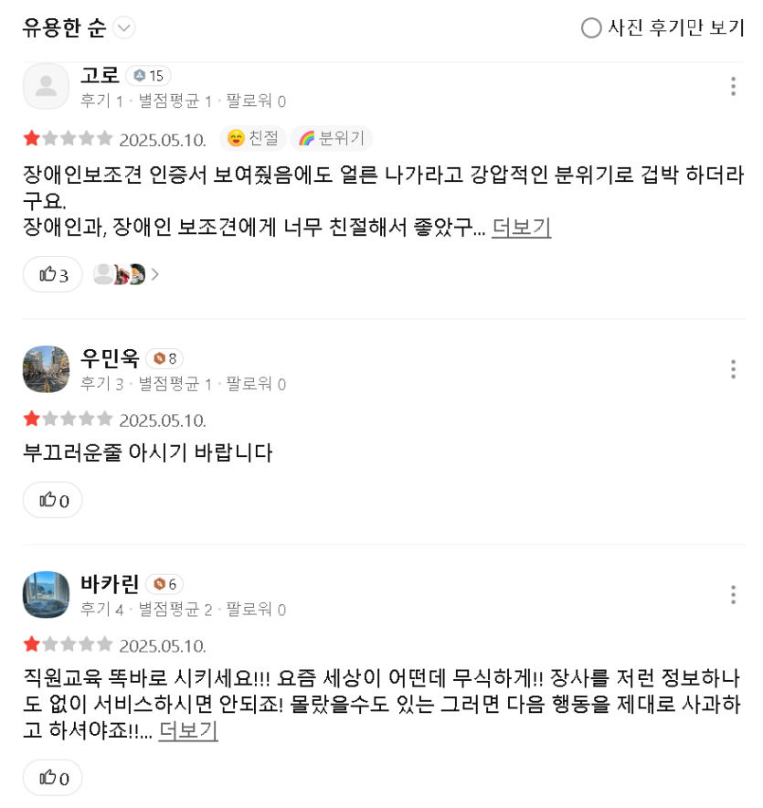 청각장애인 보조견 내쫓은 식당 리뷰 rh1 0 97 0 2025.05.11 10:15 직원랑 경찰 콜라보로 무수히 많은 별점(1)들ㅋㅋㅋ 대체 왜 이런거냐ㅋㅋㅋㅋ 청각장애인 보조견 내쫓은 식당 리뷰 0