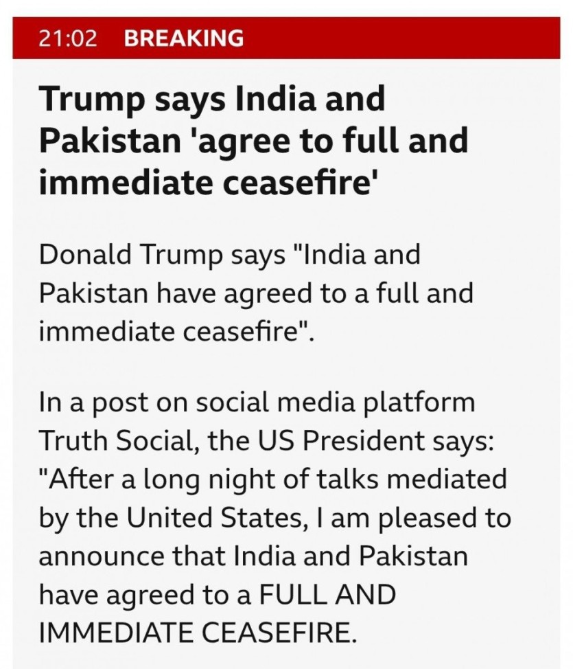 BBC 속보 미국의 중재로 인도, 파키스탄 휴전 동의 rh1 0 128 0 2025.05.11 05:15 미 대통령 도널드 트럼프는 "인도와 파키스탄이 완전하고 즉각적인 휴전에 동의했다"고 말했습니다. 소셜 미디어 플랫폼 Truth Social에 올린 게시물에서 미국 대통령은 "미국의 중재로 진행된 긴 밤의 회담 끝에 인도와 파키스탄이 완전하고 즉각적인 휴전에 합의했다는 소식을 전하게 되어 기쁩니다." 라는 게시물을 올렸습니다. BBC 속보 미국의 중재로 인도, 파키스탄 휴전 동의 0