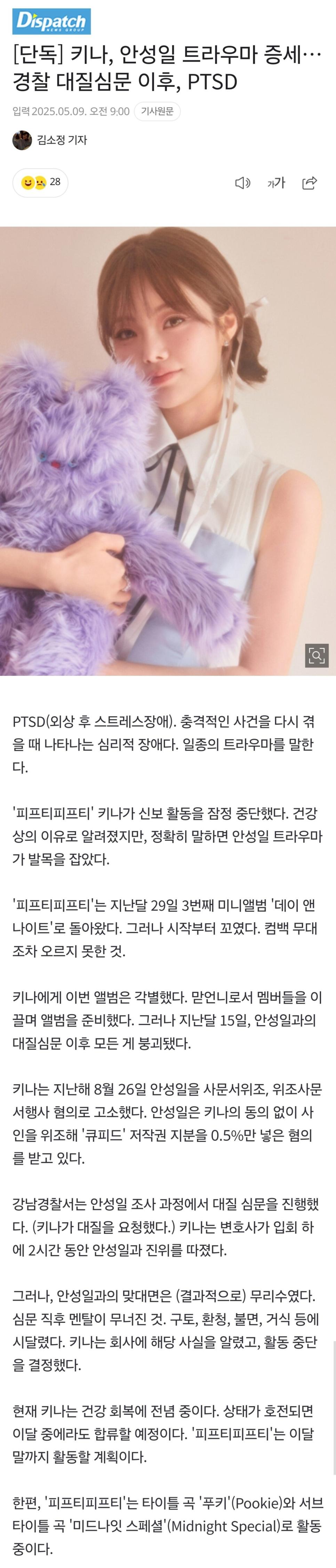 [단독] 키나, 안성일 트라우마 증세…경찰 대질심문 이후, PTSD