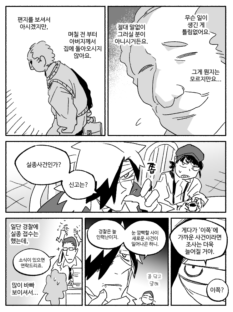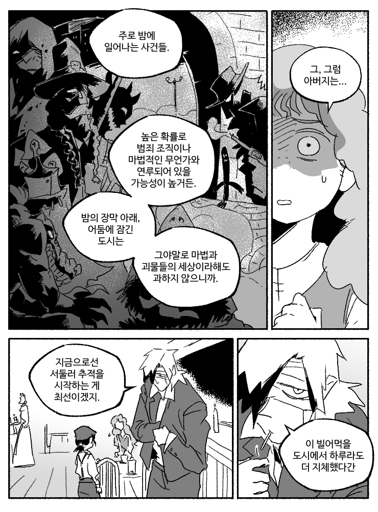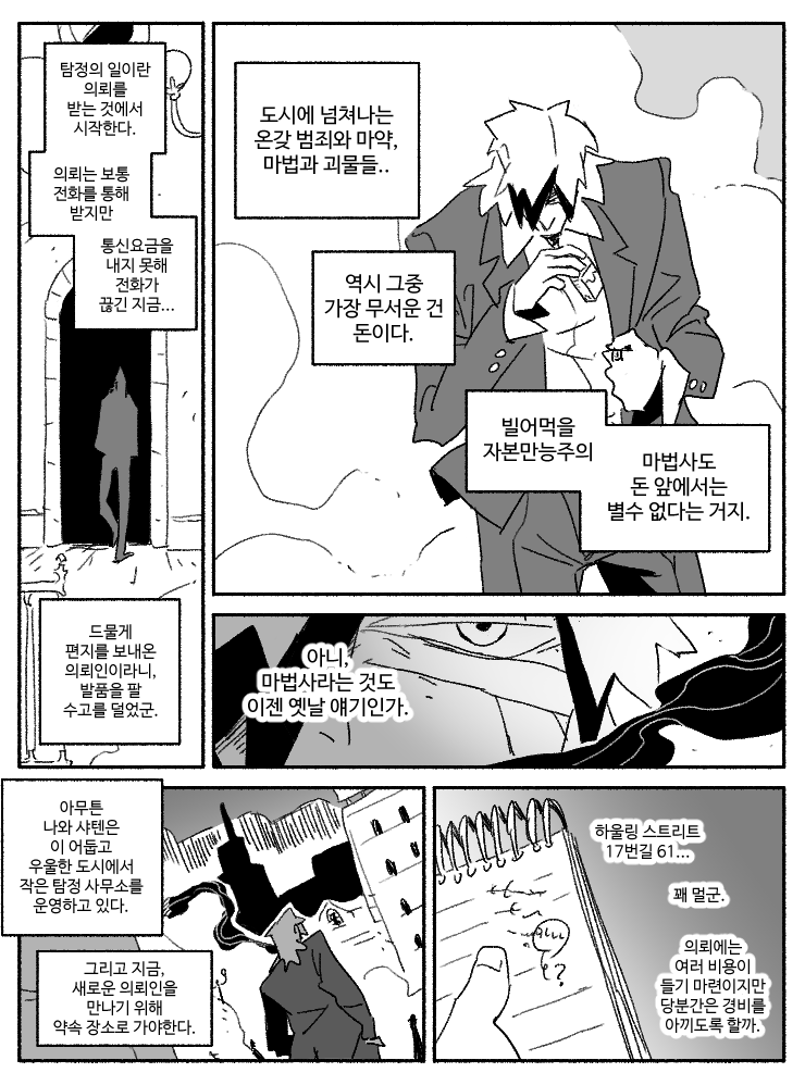 창작)암흑탐정 만화_1.manhwa rh1 0 169 0 2025.05.10 05:45 다크한 하드보일드 캐주얼 갬성 만화 보고싶어서 그렸습니다.총 8화 분량인데, 한 2~3일 간격으로 한화씩 업로드 해볼 생각입니당.감상 남겨주시면 잘 받아먹고 성장하겠습니다! 되도록이면 비난보단 칭찬이 좋구요ㅎㅎ 0